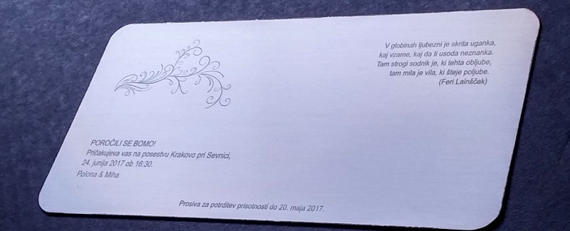 Graviranje kovin in nekovin (inox, aluminij, eloksiran aluminij, les, steklo, ogledalo, plastika, guma, pleksi, karton, marmor). Možnost globoke gravure, graviranja logotipov, posvetil, fotografij, napisov in 3D kod.Laserski razrez nekovin